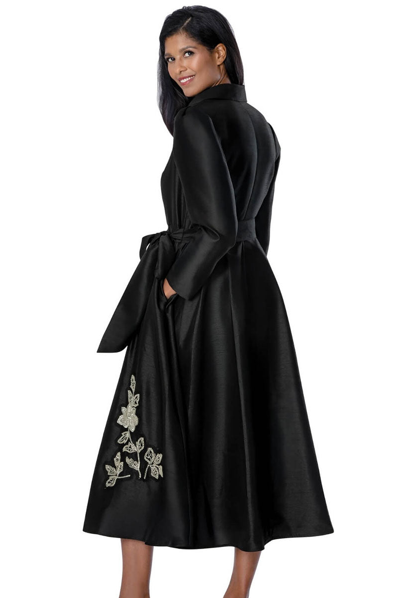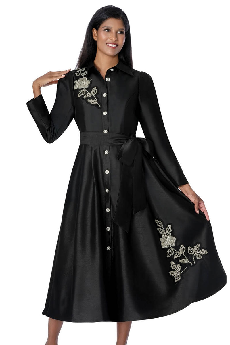 Captivate in this exquisite black midi dress featuring a rhinestone button front that gleams with every movement. Intricate beaded flowers adorning the bodice create a luxurious, handcrafted aesthetic that sets this piece apart. A coordinating sash belt cinches your waist for a flattering, feminine silhouette perfect for church services, galas, and milestone celebrations. Available in sizes 8–26W, this dress combines artisanal detail with modern elegance, ensuring you look and feel absolutely stunning.