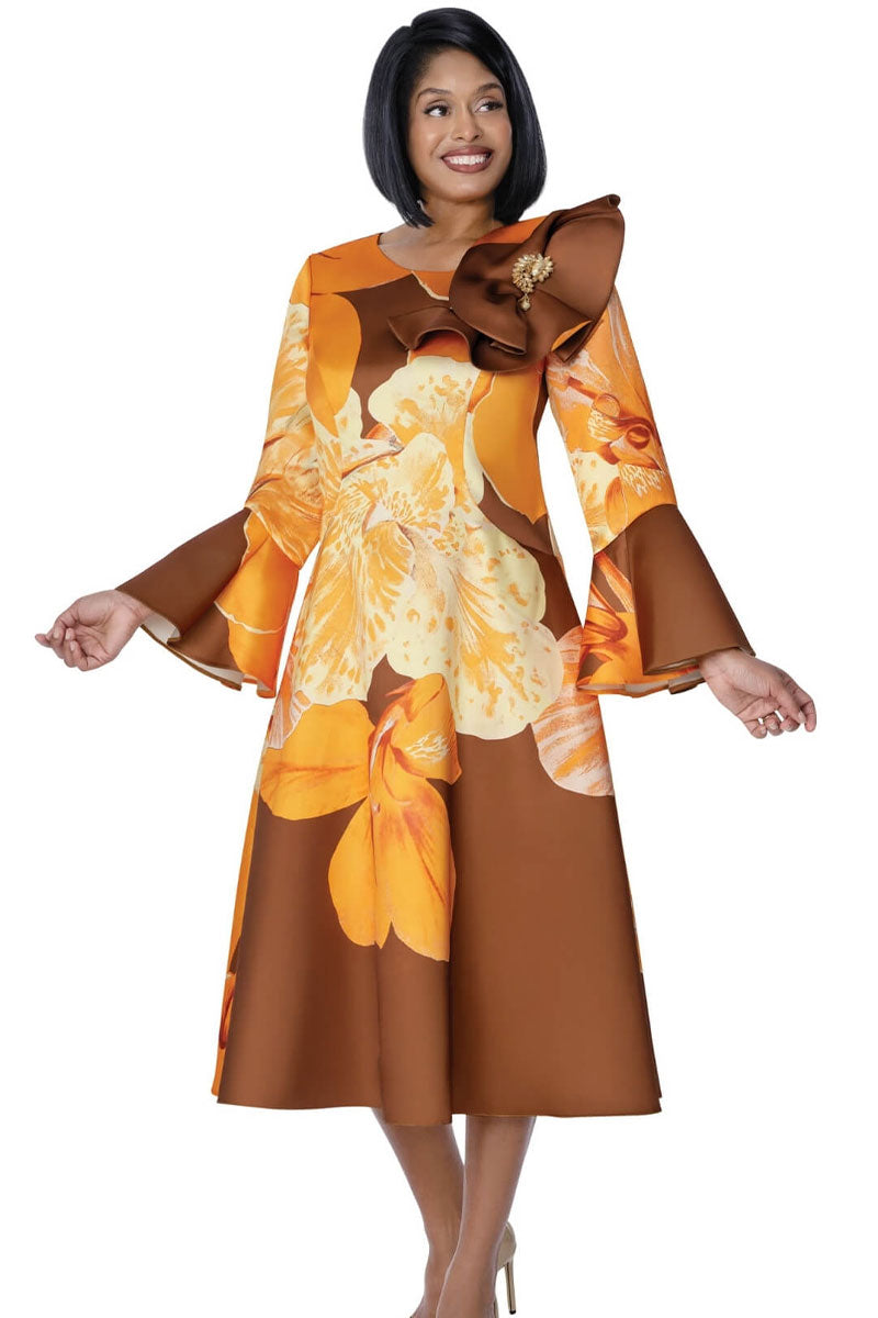 Make a statement in this stunning large flower print midi dress from Dresses by Nubiano. The rich brown and orange palette brings warmth and sophistication to any occasion, while dramatic flare sleeves add movement and elegance. A coordinating large brooch serves as the perfect finishing touch, elevating your look with timeless style. Available in sizes 8–26W, this dress flatters every figure and works beautifully for church services, special events, or elevated everyday wear. Comfortable, confident, and undeniably chic.