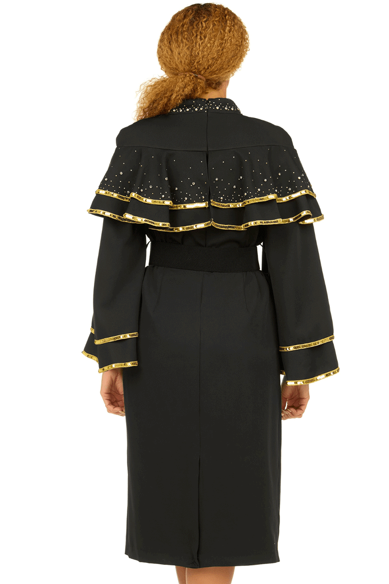 Elevate your wardrobe with the Giovanna Dress DP7215, a striking black dress featuring elegant bell sleeves and a chic capelet. The gold trim and rhinestone accents add a touch of glamour, perfect for special occasions. With a flattering belted waist and a wide size range from 10 to 24W, this dress ensures a confident fit for every body type. Make a memorable statement effortlessly in this uniquely stylish design.