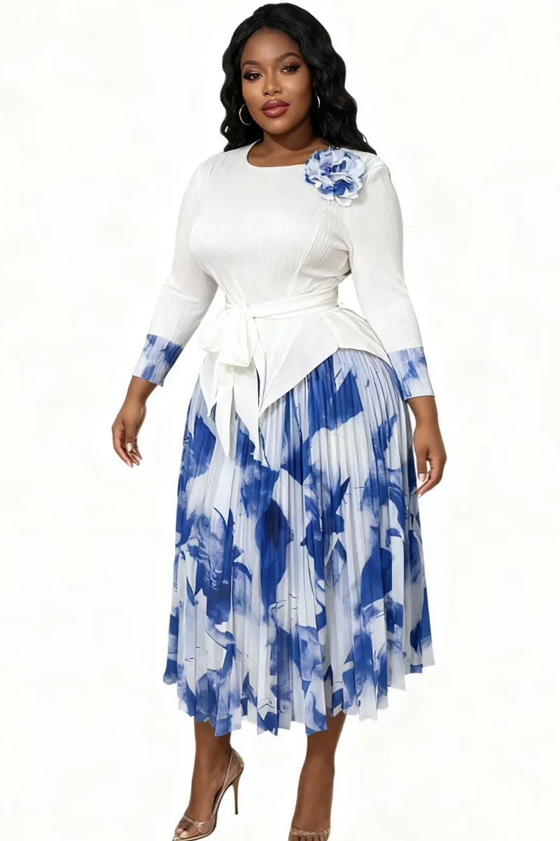 Elegant Floral Pleated Skirt Set 83013-Blue/White