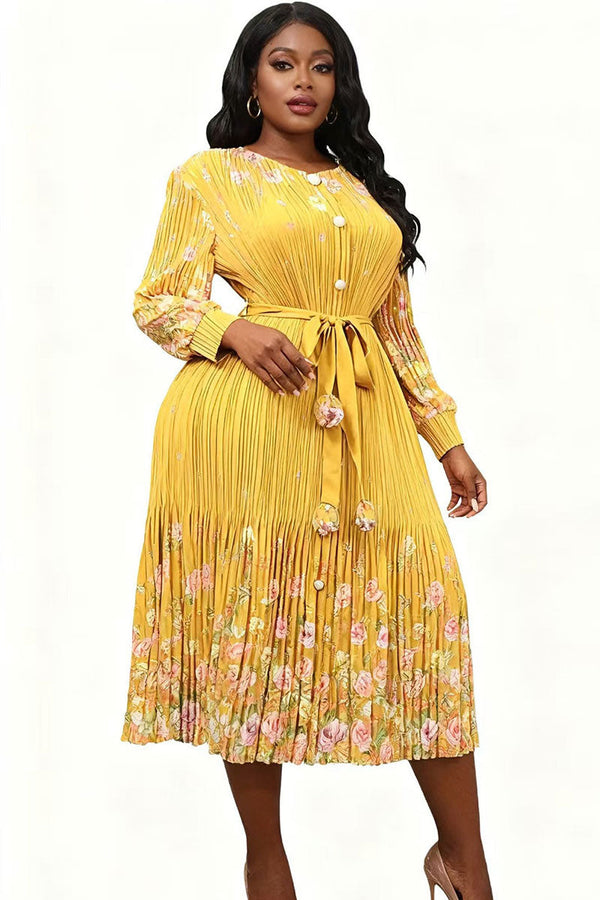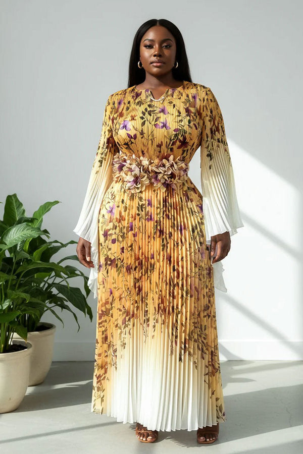 Pleated Maxi Dress with Statement Waist 83002- Yellow Multi